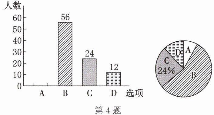 答案:4.(1)被调查的学生人数为24÷24%=100,选项A中的学生人数为100−56−24−12=8