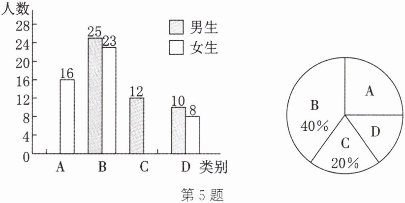 5. 某市正在开展“食品安全城市”创建活动,为了解学生对食品安全知识的了解情况,学校随机抽取了部分学生进行问卷调查,将调查结果按照“A:非常了解;B:了解;C:了解较少;D:不了解”四类分别进行统计,并绘制了如图所示的两幅不完整的统计图.