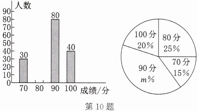 10. (2025·大庆)开展航空航天教育对提升青少年的科学素养有重要的意义. 某学校对学生进行了航空航天科普教育并组织全校学生参加航空航天知识竞赛,每名学生回答 10 题,每题 10 分. 赛后发现所有学生知识竞赛成绩(单位:分)不低于 70 分. 为了更好地了解本次知识竞赛的成绩分布情况,从所有学生答题成绩中随机抽取部分学生答题成绩作为样本进行整理,绘制了如图所示的两幅不完整的统计图. 请根据以上信息,完成下列问题: