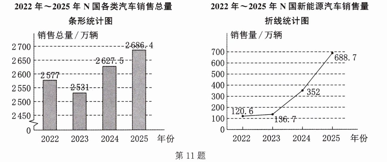 热点信息)如图所示为 N 国 2022~2025 年汽车销售情况统计图. 根据图中信息,解答下面的问题: