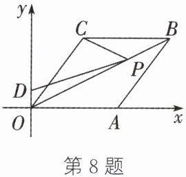 8. 在平面直角坐标系中,菱形 OABC 的位置如图所示,点 A 的坐标为$ (5,0) $,$ OB = 4\sqrt{5} $,P 是对角线 OB 上的一个动点,点 D 的坐标为$ (0,1) $。当 $ CP + DP $ 的值最小时,点 P 的坐标为(