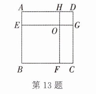 13. 如图,在正方形 ABCD 中,E,F,G,H 分别是边 AB,BC,CD,AD 上的点,EG 与 FH 相交于点 O,且 $ EG // AD $,$ FH // AB $,$ OE = OF $。若 $ S_{矩形AEOH} = 12 $,$ C_{矩形OFCG} = 16 $,则 $ S_{正方形EBFO} + S_{正方形HOGD} = $