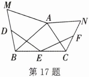 17. 如图,$ △ABC $是锐角三角形,分别以 AB,AC 为边向外作等边三角形 ABM 和等边三角形 CAN,D,E,F 分别是 MB,BC,CN 的中点,连接 DE,FE,求证:$ DE = EF $。