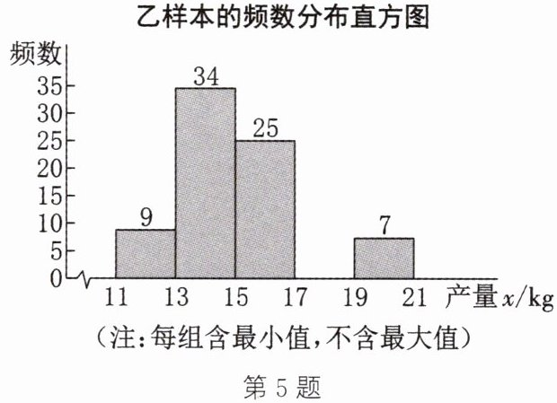 同学们采用合理的抽样调查方式获得甲、乙两个样本,并统计每株的产量x(单位:kg),将所得数据整理、描述得到如下频数分布表和不完整的频数分布直方图(如图).
