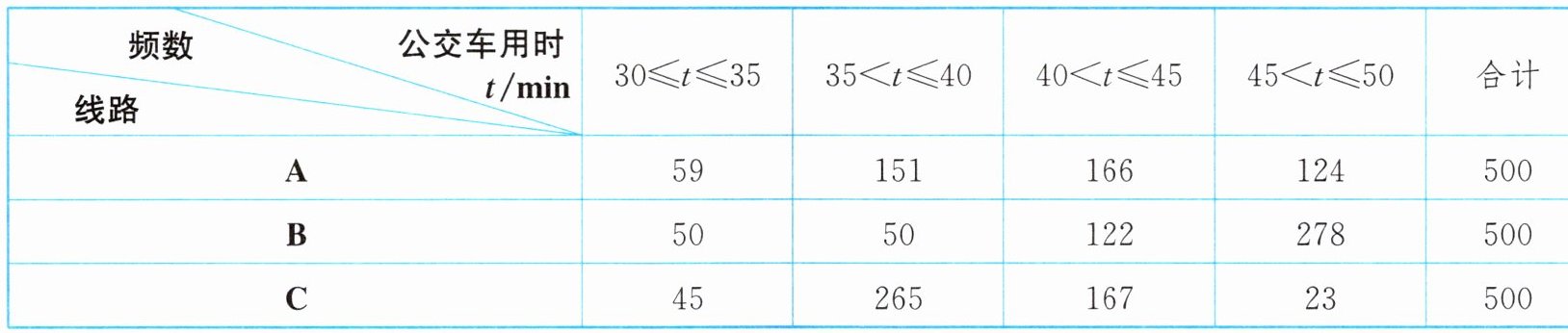 9. (新情境·现实生活)从甲地到乙地有 A,B,C 三条不同的公交线路. 为了解早高峰期间这三条线路上的公交车从甲地到乙地的用时情况,在每条线路上随机选取了 500 个班次,收集了这些班次的公交车用时 $ t(\mathrm{min}) $ 的数据,统计如下表: