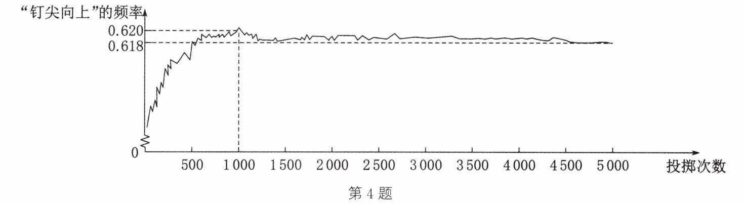 4. (教材变式)如图所示的折线统计图显示了用计算机模拟随机投掷一枚图钉的某次试验的结果. 有下列推断:① 当投掷次数是 500 时,计算机记录“钉尖向上”的次数是 308,因此“钉尖向上”的概率是 0.616;② 随着试验次数的增加,“钉尖向上”的频率总在 0.618 附近摆动,显示出一定的稳定性,可以估计“钉尖向上”的概率是 0.618;③ 若再次用计算机模拟试验,则当投掷次数是 1000 时,“钉尖向上”的概率一定是 0.620. 其中,合理的是 (