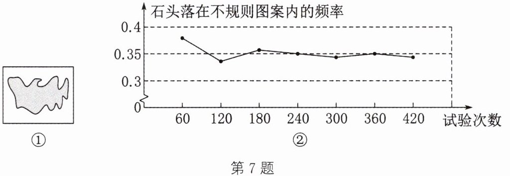 7. 如图①,平整的地面上有一个不规则图案(图中涂色部分),小明想知道该不规则图案的面积,他采取了以下办法:用一个长为 5 m、宽为 4 m 的长方形,将不规则图案围起来,然后在适当位置随机地朝长方形区域扔石头,并记录石头落在不规则图案内的次数(石头扔在界线上或长方形区域外不计试验结果). 他将若干次有效试验的结果绘制成了如图②所示的折线统计图,由此他估计该不规则图案的面积为(