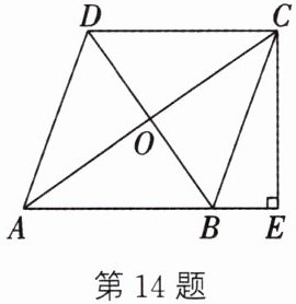 14. 如图,在$□ ABCD$中,对角线$AC$,$BD$相交于点$O$,$\angle CAB = \angle ACB$,过点$C$作$CE⊥ AB$,交$AB$的延长线于点$E$.