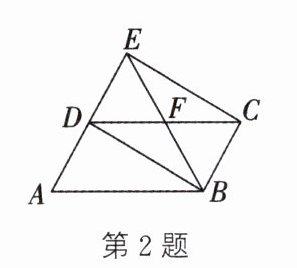 2. 如图,$E$ 是 $□ ABCD$ 的边 $AD$ 的延长线上一点,连接 $BE$,$CE$,$BD$,$BE$ 交 $CD$ 于点 $F$。添加以下条件,不能判定四边形 $BCED$ 为平行四边形的是(