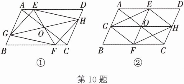 10. 如图①,在 $□ ABCD$ 中,$O$ 是对角线 $AC$ 的中点,$EF$ 过点 $O$,与 $AD$,$BC$ 分别交于点 $E$,$F$,$GH$ 过点 $O$,与 $AB$,$CD$ 分别交于点 $G$,$H$,连接 $EG$,$FG$,$FH$,$EH$.