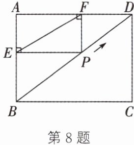答案:8.$\frac {24}{5}$解析:根据题意,得四边形AEPF为矩形,连接AP,则AP=EF,将求EF长的最小值转化成求AP长的最小值.由于垂线段最短,因此当AP⊥BD时,AP的长取得最小值.此时$S_{\triangle ABD} = \frac{1}{2}AB· AD = \frac{1}{2}BD· AP$,得$AP = \frac{24}{5},\therefore$EF长的最小值为$\frac{24}{5}$.