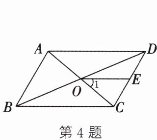4. 如图,在 $□ ABCD$ 中,对角线 $AC$ 与 $BD$ 相交于点 $O$,$E$ 是边 $CD$ 的中点,连接 $OE$. 若 $\angle ABC = 60^{\circ}$,$\angle BAC = 80^{\circ}$,则 $\angle 1$ 的度数为