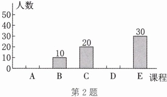 2. (2024·滨州改编)某校劳动实践基地共开设五门劳动实践课程,分别是 A:床铺整理,B:衣物清洗,C:手工制作,D:简单烹饪,E:绿植栽培. 课程开设一段时间后,李老师采用抽样调查的方式在全校学生中开展了以“我最喜欢的劳动实践课程”为主题的问卷调查. 根据调查所收集的数据进行整理,发现最喜欢“绿植栽培”的学生人数占被调查人数的 30%,最喜欢“简单烹饪”的学生人数占被调查人数的 25%. 同时绘制了如图所示的不完整的条形统计图. 根据图中信息,请解答下面的问题: