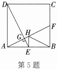 5. 如图,在正方形 $ABCD$ 中,$E$ 为 $AB$ 的中点,连接 $DE$,过点 $A$ 作 $DE$ 的垂线,垂足为 $G$,交 $BC$ 于点 $F$,$H$ 为 $AF$ 的中点,连接 $HE$,$BH$。若 $HE = 1$,则 $BH$ 的长为