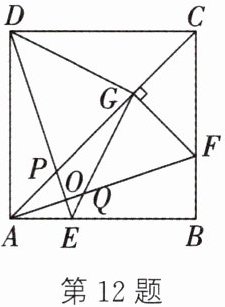 12. (2025·连云港)如图,小昕同学在正方形纸板 $ABCD$ 的边 $AB$,$BC$ 上分别取点 $E$,$F$,且 $AE = BF$,$AF$ 交 $DE$ 于点 $O$。连接 $AC$,过点 $F$ 作 $FG⊥ AC$,垂足为 $G$,连接 $GD$,$GE$,$DE$ 交 $AC$ 于点 $P$,$GE$ 交 $AF$ 于点 $Q$。
