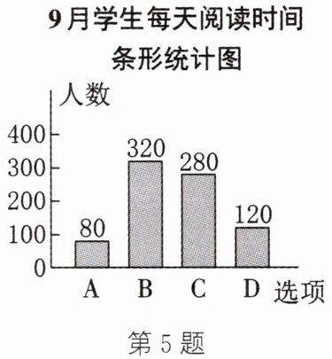 5. (新情境·现实生活)阅读涵养心灵. 某地区 2025 年 9 月就“初中生每天阅读时间”对八年级 8 000 名学生进行了抽样调查(设每天阅读时间为 t h,调查问卷设置了四个时间选项:A. $ t < 1 $; B. $ 1 \leqslant t < 1.5 $;C. $ 1.5 \leqslant t < 2 $;D. $ t \geqslant 2 $),并根据调查结果制作了如图所示的条形统计图. 2025 年 9 月该地区出台系列激励措施,力推学生阅读习惯养成. 为了检测这些措施的效果,2025 年 12 月该地区又对八年级学生进行了一次抽样调查,并根据调查得出 12 月学生每天各种阅读时间的人数占样本容量的百分比如下表: