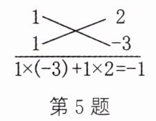 5. (新考法·阅读理解)阅读与思考:整式乘法与因式分解是方向相反的变形,由$(x + p)(x + q) = x^{2} + (p + q)x + pq$,得$x^{2} + (p + q)x + pq = (x + p)(x + q)$。利用这个式子可以将某些二次项系数是$1$的二次三项式分解因式。例如:将式子$x^{2} - x - 6$分解因式,这个式子的常数项$-6 = 2×(-3)$,一次项系数$-1 = 2 + (-3)$,这个过程可用十字相乘的形式形象地表示:先分解二次项系数,分别写在十字交叉线的左上角和左下角;再分解常数项,分别写在十字交叉线的右上角和右下角;最后交叉相乘,求代数和,使其等于一次项系数(如图),这种分解二次三项式的方法叫“十字相乘法”。