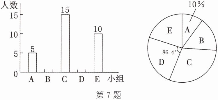 7. 八年级(1)班的同学根据兴趣可分成A,B,C,D,E五个小组,把各小组人数分布情况绘制成如图所示的不完整的统计图。根据图中信息,D小组有
