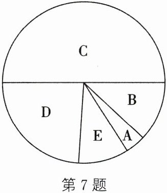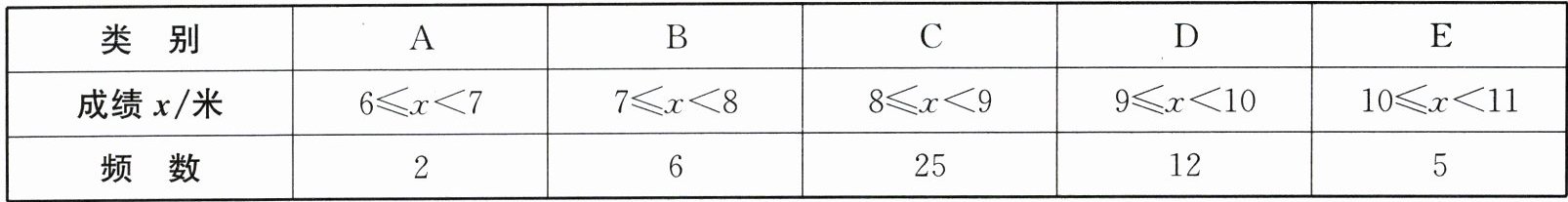 7. 2025年某市中考体育考查了投掷实心球的项目.为了解某校九年级男生投掷实心球的水平,随机抽取了若干名男生的成绩x(单位:米),列出了如下频数分布表并绘制了如图所示的扇形图:
