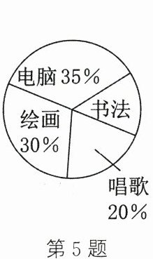 5. 如图所示为某校八年级学生参加课外兴趣小组的扇形统计图(每人只参加一项).若参加书法兴趣小组的人数是30,则参加绘画兴趣小组的人数是(