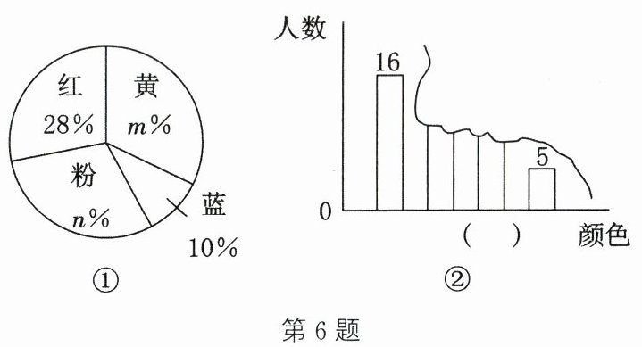 6. 小明调查了本班每名同学最喜欢的颜色,并绘制了如图①②所示的不完整的扇形统计图及条形统计图(柱的高度从高到低排列).条形统计图不小心被撕了一块,图中“(