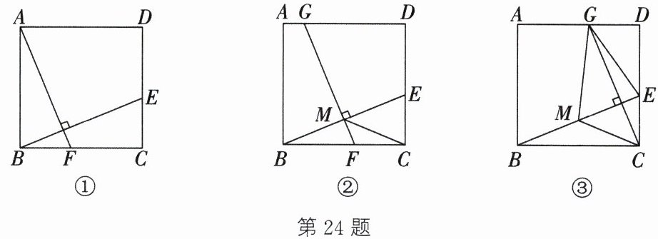 答案:24.(1)过点$G$作$GP⊥ BC$于点$P$,则$\angle BPG=\angle FPG=90^{\circ}$。$\because$四边形$ABCD$是正方形,$\therefore AB=CB$,$\angle A=\angle ABC=\angle ECB=90^{\circ}$,$\therefore$四边形$ABPG$是矩形,$\angle FPG=\angle ECB$,$\therefore PG=AB$,$\therefore PG=CB$。$\because GP⊥ BC$,$FG⊥ BE$,$\therefore\angle PGF+\angle PFG=90^{\circ}$,$\angle CBE+\angle PFG=90^{\circ}$,$\therefore\angle PGF=\angle CBE$。在$\triangle PGF$和$\triangle CBE$中,$\begin{cases}\angle PGF=\angle CBE,\\PG=CB,\\\angle FPG=\angle ECB,\end{cases}$