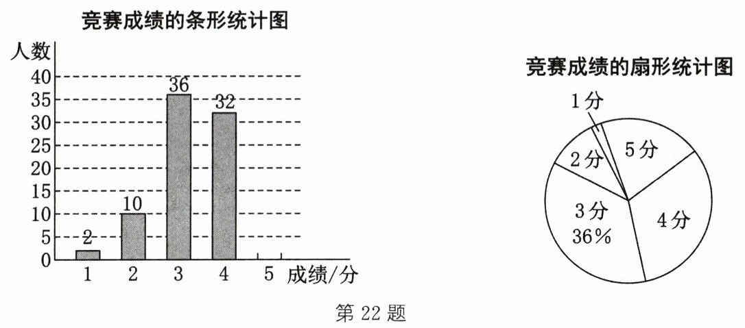 22. (8分)某校开展“中国诗词”竞赛,学生成绩为正整数,满分为5分.为了解本次竞赛的情况,从该校随机抽取m名学生的成绩作为样本,将收集的数据整理并绘制成如下两幅不完整的统计图.