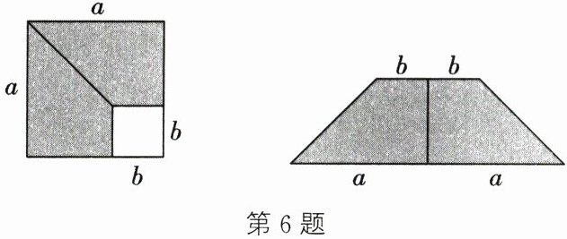 6. 如图,在边长为$ a $的正方形中,剪去一个边长为$ b $的小正方形$ (a > b) $,将余下部分拼成一个梯形,根据两个图形涂色部分面积的关系,可以得到一个关于$ a,b $的恒等式为(