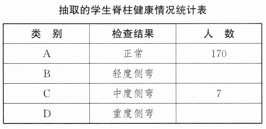 ∴估计脊柱侧弯程度为中度和重度的总人数是80 (3)答案不唯一,如该校学生脊柱侧弯人数约占全校总人数的15\%,说明该校学生脊柱侧弯情况较为严重,建议学校要每天组织学生做护脊操