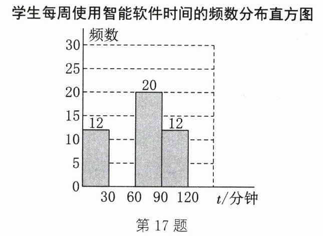 第二步:将“问题2”中每周使用智能软件的时间t(分钟)整理分成4组:①0≤t<30;②30≤t<60;③60≤t<90;④90≤t≤120,并绘制成如图所示的频数分布直方图.