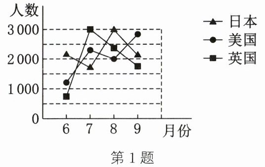 1. 如图所示为甲城市 6~9 月外国旅客人数的折线统计图. 据此可以判断到甲城市的外国旅客中,旅客人数最少的国家是美国的月份是(