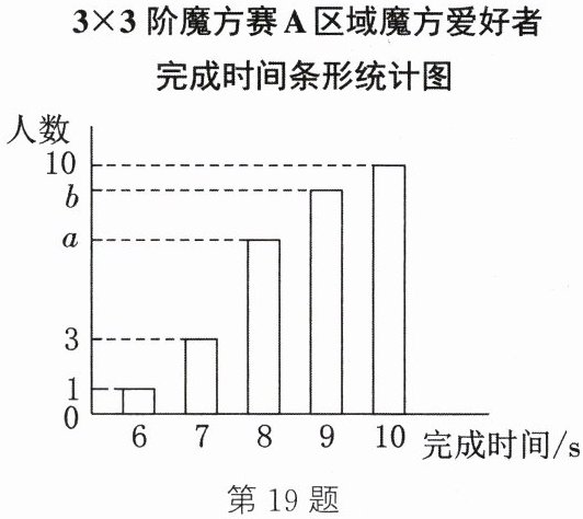 19. (12 分)某次世界魔方大赛吸引了世界各地共 600 名魔方爱好者参加,本次大赛首轮进行 $3×3$ 阶魔方赛,组委会随机将魔方爱好者平均分到 20 个区域,每个区域 30 名魔方爱好者同时进行比赛,完成时间小于 8 s 的魔方爱好者进入下一轮角逐. 如图所示为 $3×3$ 阶魔方赛 A 区域 30 名魔方爱好者完成时间条形统计图.