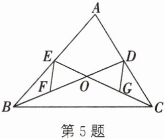 答案:5. EF// DG,EF = DG 连接$ AO.\because CE $是$ \triangle ABC $的中线$,\therefore E $是 AB 的中点.又$\because F $是 OB 的中点$,\therefore EF $是$ \triangle ABO $的中位线$,\therefore EF// AO,$且$ EF = \frac{1}{2}AO. $同理,可得 DG// AO,且$ DG = \frac{1}{2}AO.\therefore EF// DG,EF = DG$