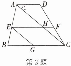 3. 如图,在梯形$ABCD$中,$AD// BC$,点$E$,$F$分别在腰$AB$,$DC$上,连接$AC$,$EF$交于点$H$,且$EF// BC$,过点$E$作$EG// AC$,交$BC$于点$G$。在不添加任何辅助线的前提下,图中与$\angle 1$相等的角(除$\angle 1$外)有