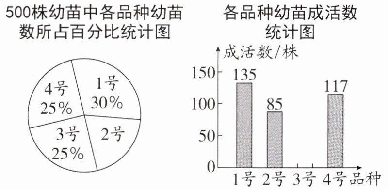 3. 某生态示范园要对 1 号、2 号、3 号、4 号四个品种共 500 株果树幼苗进行成活试验,从中选出成活率高的品种进行推广.通过试验得知,3 号果树幼苗成活率为 89.6%.把试验数据绘制成如图两幅统计图(部分信息未给出):