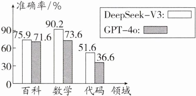 2. (2025·徐州期中)杭州深度求索公司推出了其自主研发的开源模型——DeepSeek-V3,在多项性能评测中表现出色,引起世界关注.如图是该模型与美国 GPT-4o 模型在百科、数学及代码等领域的相关测试数据,通常用$\frac{a - b}{b}×100\%$的值表示$a$对$b$的相对优势.那么由图中数据可知,DeepSeek-V3 比 GPT-4o 在