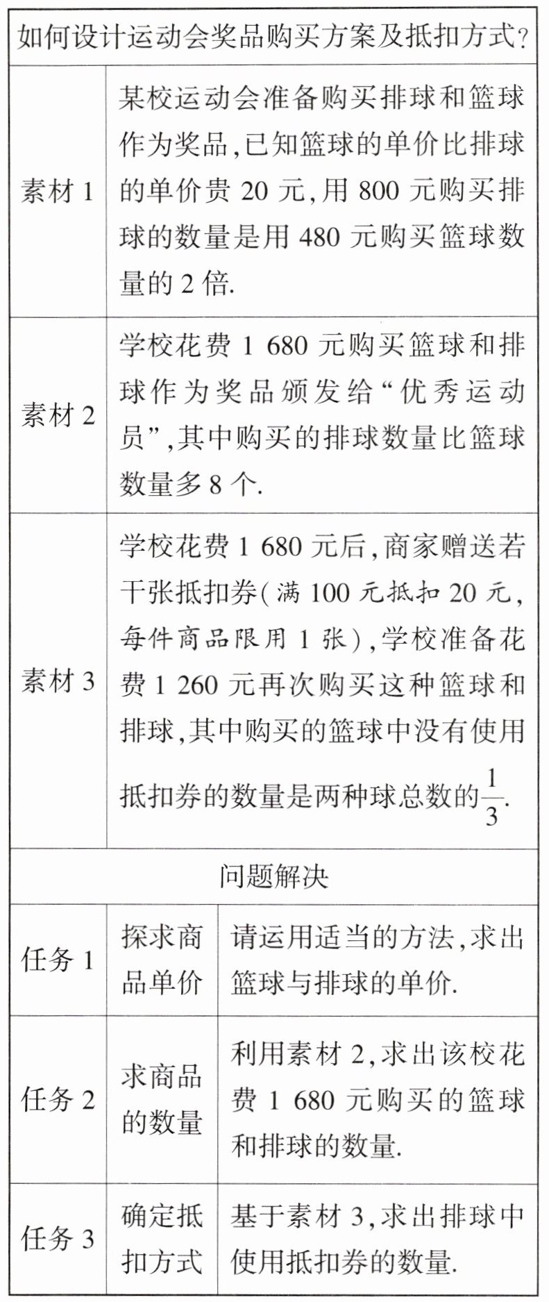 任务3:设第二次购买了$a$个篮球,$b$个排球,且购买的排球中使用抵扣券的数量是$c$个,则第二次购买的篮球中没有使用抵扣券的数量是$\frac {a + b}{3}$个,$\therefore$第二次购买的篮球中使用抵扣券的数量是$a - \frac {a + b}{3}=\frac {2a - b}{3}$(个),$\therefore 120a + 100b - 20(c + \frac {2a - b}{3}) = 1260$,$\therefore \frac {320}{3}a + \frac {320}{3}b - 20c = 1260$,$\therefore 16(a + b) - 3c = 189$.$\because \frac {a + b}{3}$一定是正整数,$\therefore a + b$一定是3的倍数,设$a + b = 3k$($k$为正整数),$\therefore 48k - 3c = 189$,$\therefore 16k - c = 63$,$\therefore c = 16k - 63$,$\therefore 16k - 63 < 3k$,解得$k < \frac {63}{13}$.又$\because k$为正整数,$c$为非负数,$\therefore$只有$k = 4$,$c = 1$满足题意.答:排球中使用抵扣券的数量为1.