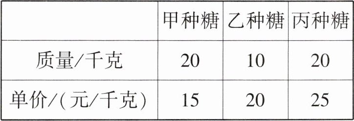 17. 现有甲、乙、丙三种糖混合而成的什锦糖 50 千克,其中各种糖的质量和单价如下表。