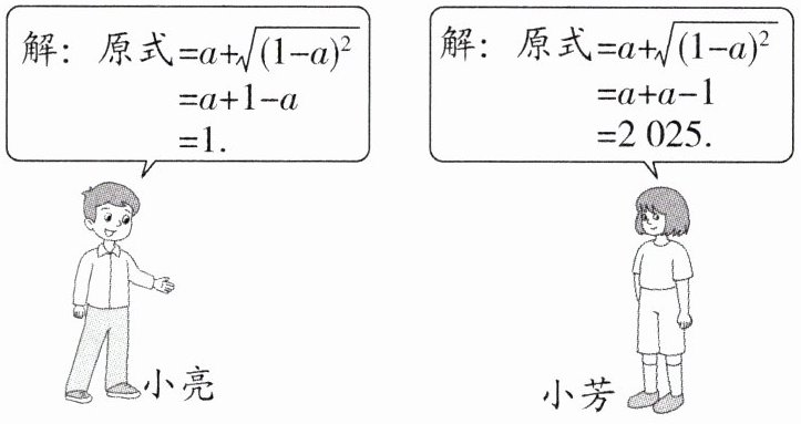 7. 新趋势 过程性学习 (2025·天津期中)求代数式$a + \sqrt{1 - 2a + a^{2}}$的值,其中$a = 1013$,如图所示的是小亮和小芳的解答过程。