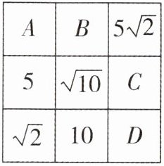 答案:10. $3\sqrt{5}+3$ 解析:对角线方向上的实数相乘的结果为$5\sqrt{2}×\sqrt{10}×\sqrt{2}=10\sqrt{10}$,根据方格中横向、纵向及对角线方向上的实数相乘的结果都相等得$A×5×\sqrt{2}=10\sqrt{10}$,解得$A=2\sqrt{5}$,$B×\sqrt{10}×10=10\sqrt{10}$,解得$B=1$,$5×\sqrt{10}× C=10\sqrt{10}$,解得$C=2$,$\sqrt{2}×10× D=10\sqrt{10}$,解得$D=\sqrt{5}$,