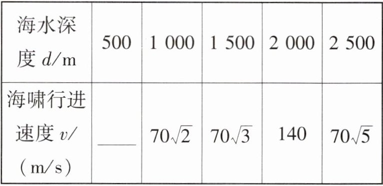 ∴ 随着海水深度d的增加,海啸速度v必然逐渐增大,描述①正确;②“当海水的深度是100 m的k倍时,海啸的行进速度是$70\sqrt{k}\ \mathrm{m/s}$”,设海水深度$d = 100k(k > 0)$,代入速度公式,得$v=\sqrt{gd}=\sqrt{9.8×100k}=\sqrt{980k}$,化简$\sqrt{980k}$得$\sqrt{980k}=\sqrt{49×20k}=7\sqrt{20k}=7×2\sqrt{5k}=14\sqrt{5k}$,而题目中表述为“$70\sqrt{k}\ \mathrm{m/s}$”描述②错误;③由表格可得d从500 m增加至1 000 m时,v从70 m/s增大至$70\sqrt{2}\ \mathrm{m/s}$,d从1 000 m增加至1 500 m时,v从$70\sqrt{2}\ \mathrm{m/s}$增大至$70\sqrt{3}\ \mathrm{m/s}$,
