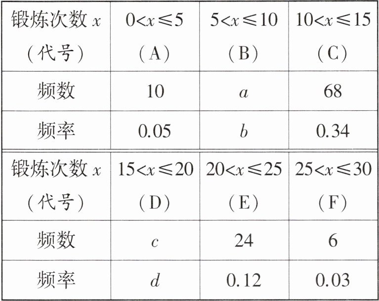 8. (无锡中考)某企业为推进全民健身活动,提升员工身体素质,号召员工开展健身锻炼活动,经过两个月的宣传发动,员工健身锻炼的意识有了显著提高.为了调查本企业员工上月参加健身锻炼的情况,现从$1500$名员工中随机抽取$200$人调查每人上月健身锻炼的次数,并将调查所得的数据整理如下: