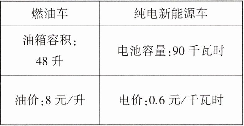 3. (2025·宿迁期末)当前,随着新一轮科技革命和产业变革孕育兴起,新能源汽车产业正进入加速发展的新阶段.2023年,我国已成为全球最大的新能源汽车市场,“购买新能源汽车到底划不划算?”是消费者关心的话题之一.下面是车身价相同的燃油车与新能源汽车的部分相关信息对比: