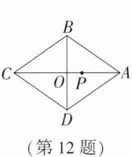 12. 如图,在菱形 $ABCD$ 中,对角线 $AC$,$BD$ 相交于点 $O$。$AC = 8\ \mathrm{cm}$,$BD = 6\ \mathrm{cm}$,点 $P$ 为 $AC$ 上一动点,点 $P$ 以 $1\ \mathrm{cm/s}$ 的速度从点 $A$ 出发沿 $AC$ 向点 $C$ 运动。设运动时间为 $t\ \mathrm{s}$,当 $t$ 的值为