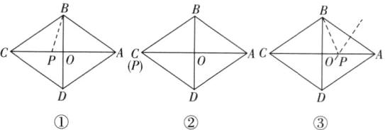 ∴AC⊥BD,AO=OC=4cm,BO=OD=3cm.由勾股定理得BC=AB=AD=CD=5cm.分为三种情况:如图①,当PA=AB=5cm时,t=5÷1=5(s);如图②,当点P和点C重合时,PB=AB=5cm,t=8÷1=8(s);如图③,作AB的垂直平分线交AC于点P,连接PB,此时PB=PA,在Rt△BOP中,由勾股定理得BP²=BO²+OP²,即AP²=3²+(4−AP)²,解得AP=25/8,此时t=25/8÷1=25/8(s).故答案为5或8或25/8.