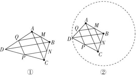 当AC=BD时,即以点B为圆心,AC的长为半径画圆,在圆弧上任取一点D(不与三点A,B,C中两点共线),如图②,同上得MQ=PN=1/2BD,MN=PQ=1/2AC,则有MQ=PQ=PN=MN,