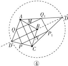 当且仅当PQ=QM,PQ⊥QM,即BD⊥AC,BD=AC时,四边形MNPQ才是正方形,即点D必须在以点B为圆心,AC的长为半径的圆上,且在过点B作AC的垂线上,这样的点D在AC左侧,右侧各一个,共有2个,如图④,故存在两个四边形MNPQ是正方形,故④正确.故选D.
