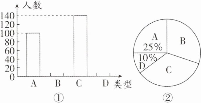答案:6. A 解析:调查学生的总数为 $ 100÷25\% = 400 $(人),$ \therefore $ 类型 $ D $ 的人数为 $ 400×10\% = 40 $.类型 $ C $ 所占百分比为 $ \dfrac{140}{400}×100\% = 35\% $,故选项 A 说法错误;类型 $ D $ 所对应的扇形的圆心角为 $ \dfrac{40}{400}×360^{\circ}=36^{\circ} $,故选项 B 说法正确;样本容量为 400,故选项 C 说法正确;类型 $ B $ 的人数为 $ 400 - 100 - 140 - 40 = 120 $,故选项 D 说法正确.故选 A.