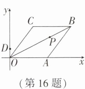 答案:16. $ (\dfrac{10}{7},\dfrac{5}{7}) $ 解析:如图,连接 $ AC $,$ AD $,分别交 $ OB $ 于点 $ G $,$ P $,连接 $ CP $,作 $ BK⊥ OA $ 于点 $ K $.$ \because $ 四边形 $ OABC $ 是菱形,$ \therefore AC⊥ OB $,$ GC = AG $,$ AB = OA = 5 $,$ OG = BG=\dfrac{1}{2}OB = 2\sqrt{5} $.$ \because A $,$ C $ 关于直线 $ OB $ 对称,$ \therefore PC + PD = PA + PD = DA $,$ \therefore $ 此时 $ PC + PD $ 最短.在 $ \mathrm{Rt}△ AOG $ 中,$ AG=\sqrt{OA^{2}-OG^{2}}=\sqrt{5^{2}-(2\sqrt{5})^{2}}=\sqrt{5} $,$ \therefore AC = 2\sqrt{5} $.$ \because OA· BK=\dfrac{1}{2}AC· OB $,$ \therefore BK = 4 $.在 $ \mathrm{Rt}△ AKB $ 中,$ AK=\sqrt{AB^{2}-BK^{2}}=\sqrt{5^{2}-4^{2}} = 3 $,$ \therefore $ 点 $ B $ 的坐标为 $ (8,4) $.用待定系数法可求得直线 $ OB $ 的表达式为 $ y=\dfrac{1}{2}x $,直线 $ AD $ 的表达式为 $ y=-\dfrac{1}{5}x + 1 $,由 $ \begin{cases}y=\dfrac{1}{2}x,\\y=-\dfrac{1}{5}x + 1,\end{cases} $ 解得 $ \begin{cases}x=\dfrac{10}{7},\\y=\dfrac{5}{7}.\end{cases} $ $ \therefore $ 点 $ P $ 的坐标为 $ (\dfrac{10}{7},\dfrac{5}{7}) $.