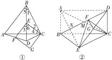 (2)如图①,$ \because $ 四边形 $ ABCD $ 是“垂等四边形”,$ \therefore AC = BD $,$ AC⊥ BD $.$ \because $ 点 $ E $,$ F $ 分别是 $ BD $,$ AD $ 的中点,$ \therefore EF// AB $,$ EF=\dfrac{1}{2}AB $.$ \because AB = AC $,$ \therefore AB = DB $,$ \therefore ∠3=∠5 $.$ \because $ 由上已证 $ EC=\dfrac{1}{2}BD $,$ \therefore EF = EC $.$ \because $ 四边形 $ CEFG $ 为平行四边形,$ \therefore $ 四边形 $ CEFG $ 是菱形.$ \because ∠3=∠5 $,$ ∠5=∠4 $,$ \therefore ∠3=∠4 $.$ \because AC⊥ BD $,$ \therefore ∠4+∠6=∠3+∠6=∠ FEC = 90^{\circ} $,$ \therefore $ 四边形 $ CEFG $ 是正方形.